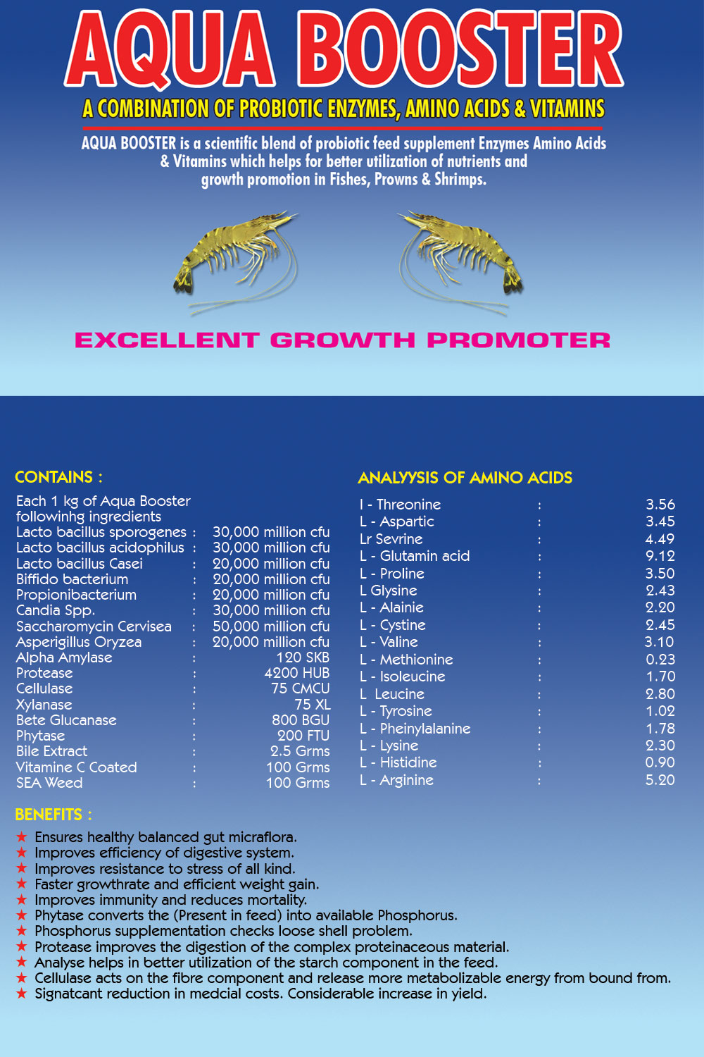 Aqua Booster is a scientific blend of probiotic feed supplement Enzymes Amino Acids & Vitamins which helps for better utilization of nutrients and growth promotion in Fishes, Prawns & Shrimps.