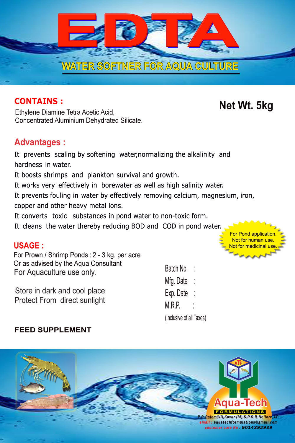 For Prawn / Shrimp Ponds : 2 - 3 kg. per Acre Or as advised by the Aqua Consultant